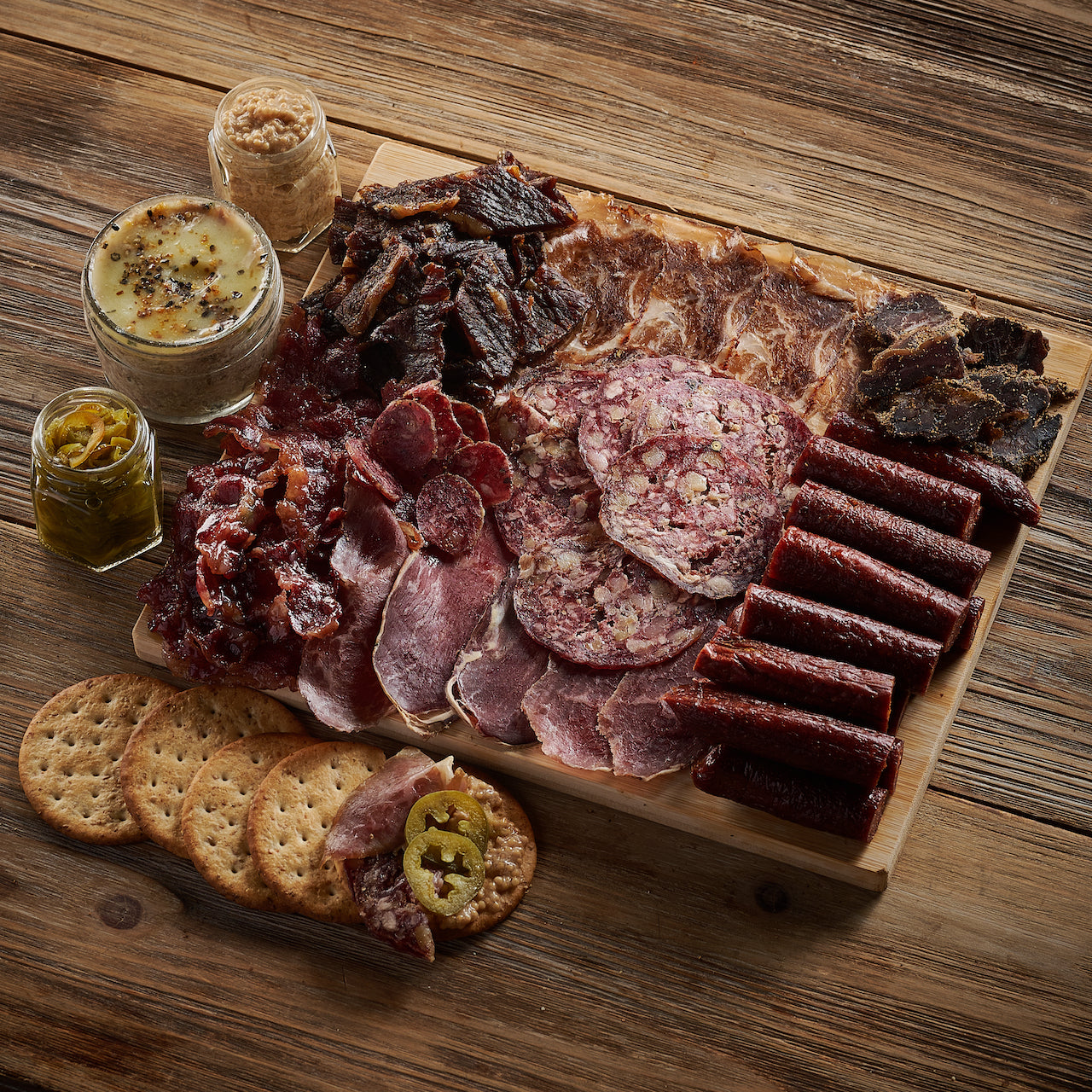 Includes: Coppa, Bresaola, Beef Jerky, Meat Candy, Biltong, Beef Sticks, Pâté, Pom Jam, Sausage, Cowboy Candy, and Crackers.